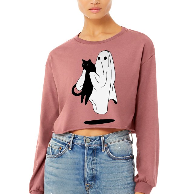Ghost With Cat Cropped Long Sleeve T-Shirt – Presents for Her – Ghost Print Presents
